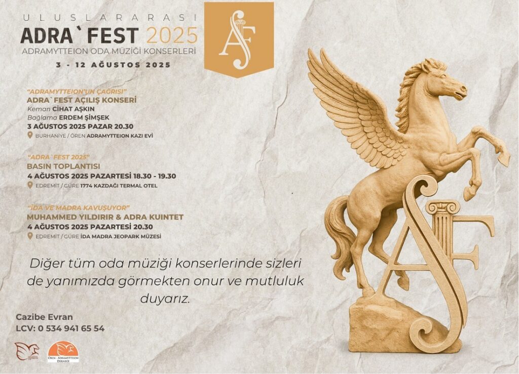 Ören-Adramytteion Derneği yürütücülüğünde “Kültürlerarası” temasıyla sanat yönetmenliğini uluslararası keman sanatçısı Cihat Aşkın’ın yaptığı arkeoloji ve müzik yolculuğunda konserlerimiz 3-12 Ağustos 2025 tarihleri arasında gerçekleşecektir.