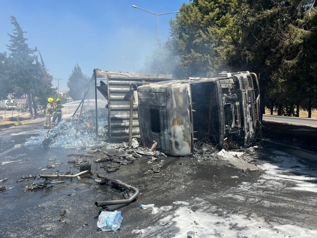 C.S. idaresindeki 16 AAB 185 plakalı kağıt havlu ve şişelenmiş su taşıyan tır, İzmir-İstanbul kara yolunda henüz bilinmeyen nedenle devrildi.
