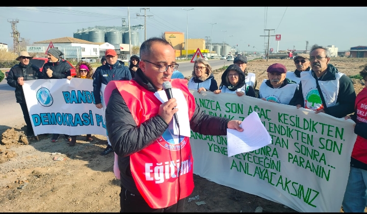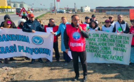 Bandırma Bursa Karayolu güzergahında şirket merkezi girişinde gerçekleştirilen basın açıklamasını platform sözcüsü Serdar Polat okudu.