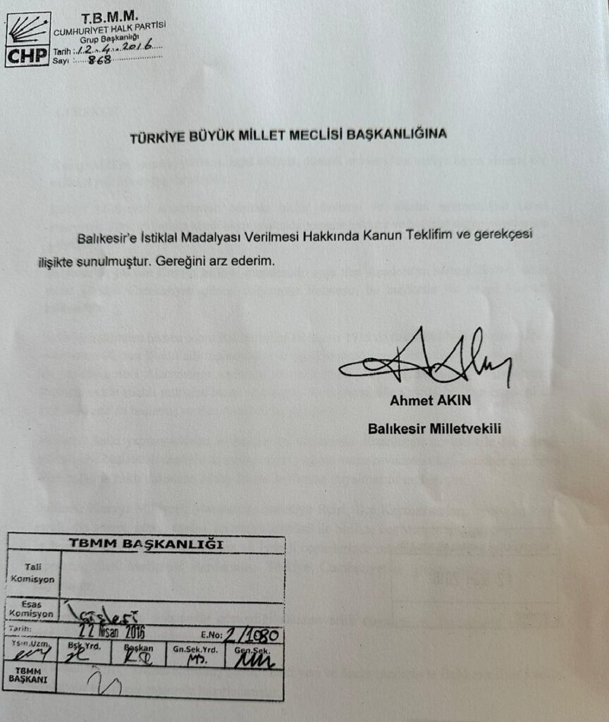 Kurtuluş Savaşı’nda kahramanlık destanı yazan Balıkesir’in İstiklal Madalyası ile onurlandırılması için milletvekilliği döneminde büyük mücadele veren Balıkesir Büyükşehir Belediye Başkanı Ahmet Akın, belediye başkanlığı sürecinde de bu konunun takipçisi olmaya devam ediyor. Kuvayımilliye’nin yiğit evlatlarına İstiklal Madalyası’nın “bir vefa borcu” olduğunu ifade eden Akın, tüm milletvekillerini ve siyaset kurumunu bu konuda birlikte hareket etmeye davet etti.