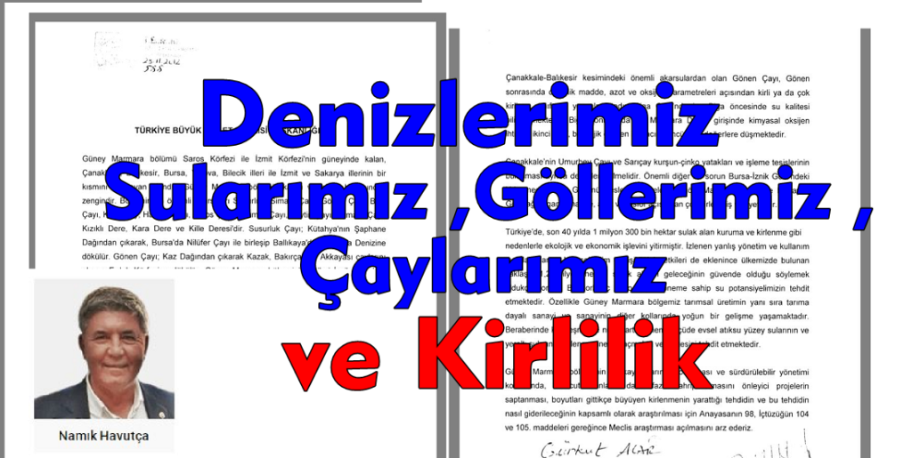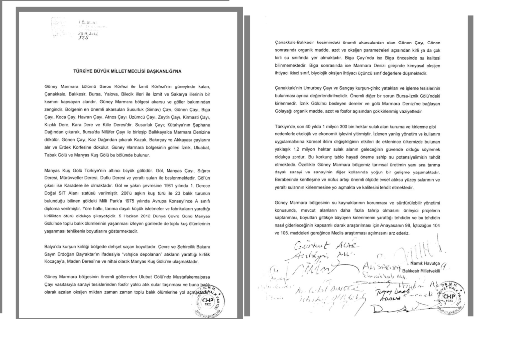 Güney Marmara’daki kirlenen su kaynaklarına ilişkin TBMM’ye sunduğumuz araştırma önergesi bugün hâlâ Meclis arşivlerinde bilimsel bir rapor olarak durmaktadır.