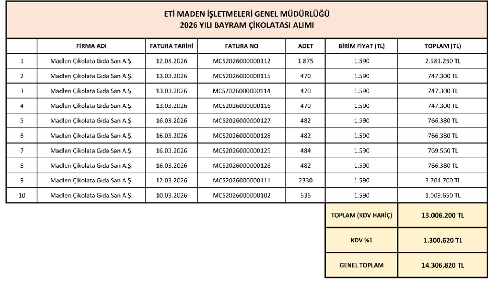 Kamu şirketlerinden Eti Maden İşletmeleri’nin bayram öncesi yaptığı iddia edilen çikolata alımı tartışma konusu oldu. CHP’li Deniz Yavuzyılmaz, söz konusu harcamaya ilişkin dikkat çeken bir açıklama yaptı. Yavuzyılmaz, yaptığı değerlendirmede Eti Maden tarafından bayram hediyesi kapsamında gerçekleştirildiği öne sürülen çikolata alımı için yaklaşık 14 milyon 306 bin TL tutarında bir ödeme yapıldığını “tespit ettiklerini” ifade etti. Açıklamada, söz konusu harcamanın kamu kaynaklarının kullanımı açısından fahiş bir miktar olan faturaların sorgulanması gerektiği vurgulandı.