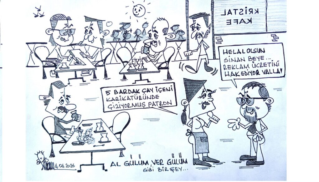 İki gün önce bana çay ısmarlayan Aliosman Beyi (Huysuz İhtiyar) hiç hinlik düşünmeden, tamamen safiyane duygularla tşk amacıyla karikatürümde çizince birdenbire “Hocam, n’olur, karikatüründe beni de çizer misin? ” diye teklifler gelmeye başladı. Fırsatları değerlendirmek gerekir… miş karikatürüm aklıma geldi. “Nasıl olsa karikatür çiziyorum, teklifleri değerlendirsem elime yapısmaz ya!” diye düşünüp bu cinlik aklıma geldi, uygulamaya başladım. Böylece hem mekan sahibi kazanıyor, hem de aldığım reklam ücretinin hakkını vermiş olduğum için vicdanen rahatlıyorum. Ayrıca bir ay sonra artı gelir için yeniden pazarlığa oturunca pazarlık gücüm artmış olacak …Siz ne dersiniz bilmem ama ilk defa alçakgönüllü davranmayıp “Aklımı seveyim, aferin bana” diyorum. Umarım sizler de beni takdir edersiniz. Du bakalım n’olcek?***