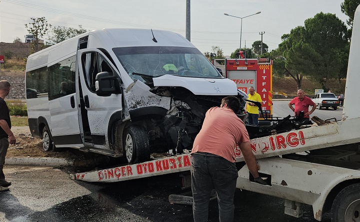 Balıkesir’in Sındırgı ilçesinde işçi servisi ile hafif ticari aracın çarpışması sonucu 4 kişi yaralandı.