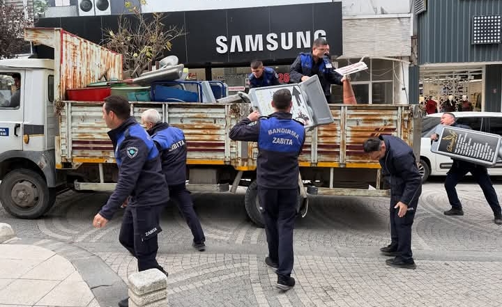 Bandırma Belediyesi zabıta ekipleri özellikle ticaretin yoğun yaşandığı çarşı içinde ana cadde ve sokaklarda kaldırımlara konuşlandırılan masa sandalye reklam tabelası ve diğer sahipsiz materyalleri kaldırdı.